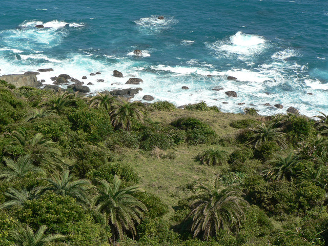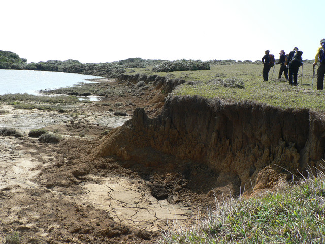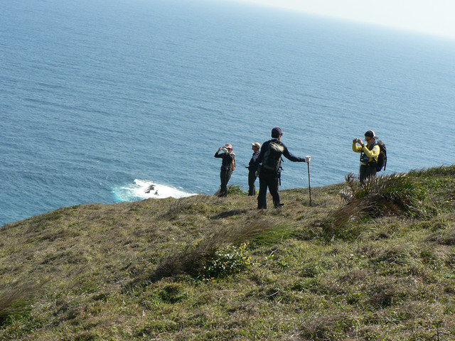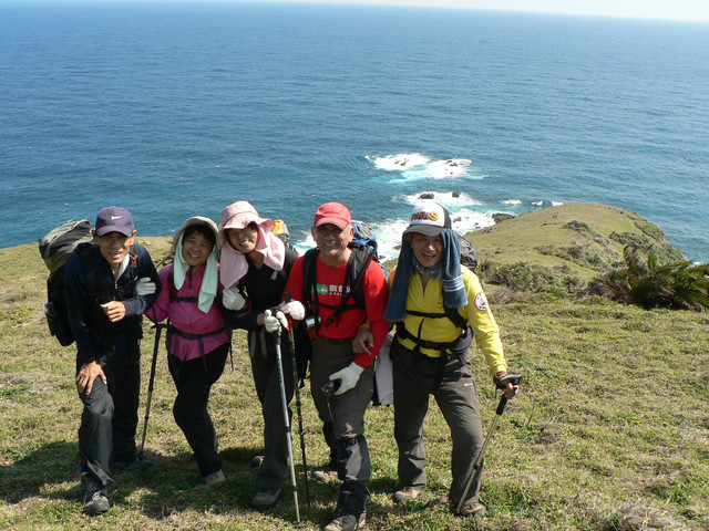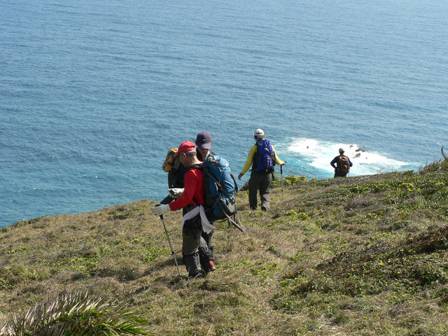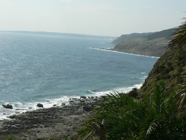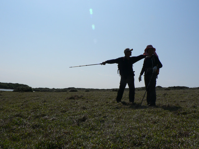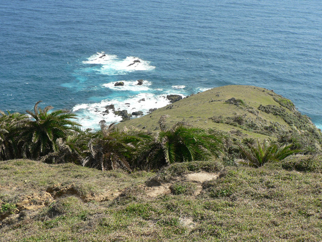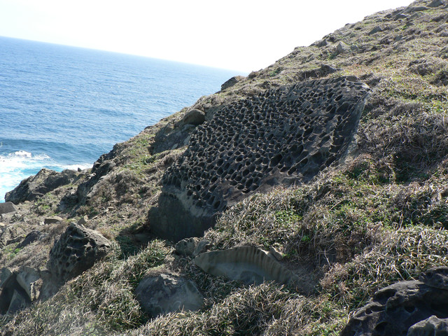 大草原讓人視野大開美麗的巴士海峽就在眼前.還有一池塘及水牛.在地路標不明走錯路又被林投葉剌得很痛最後才到出風鼻多費了40分.下了出風鼻全是砂岩