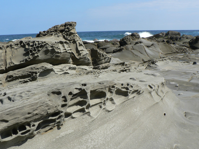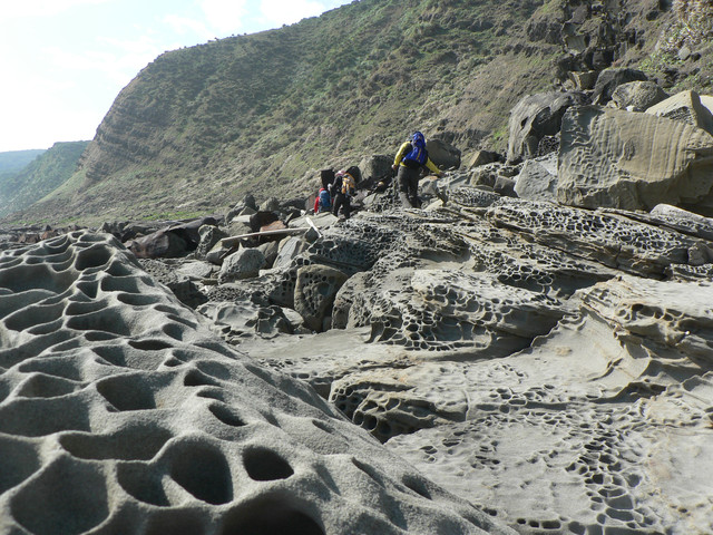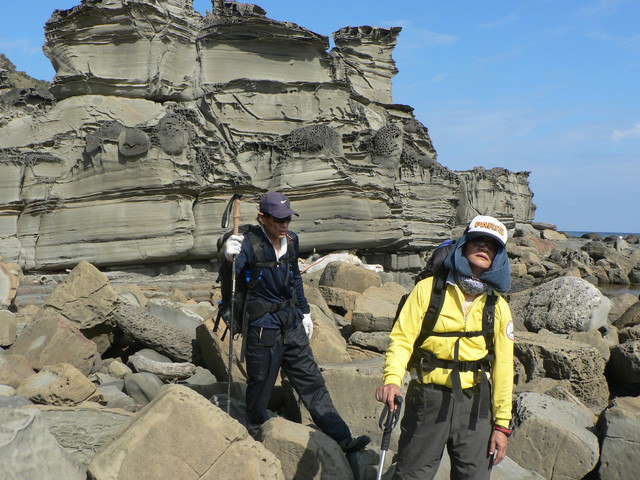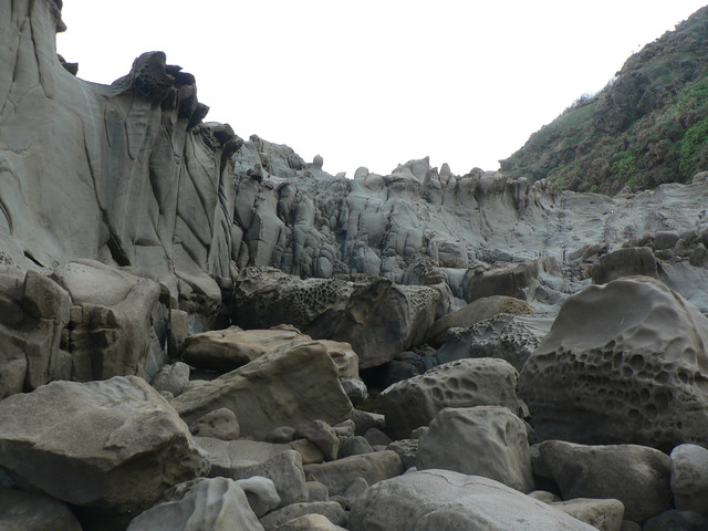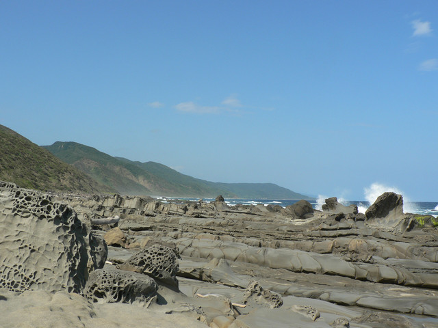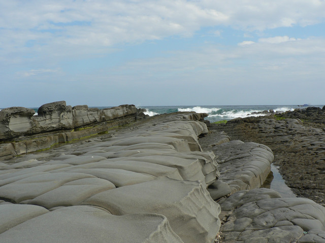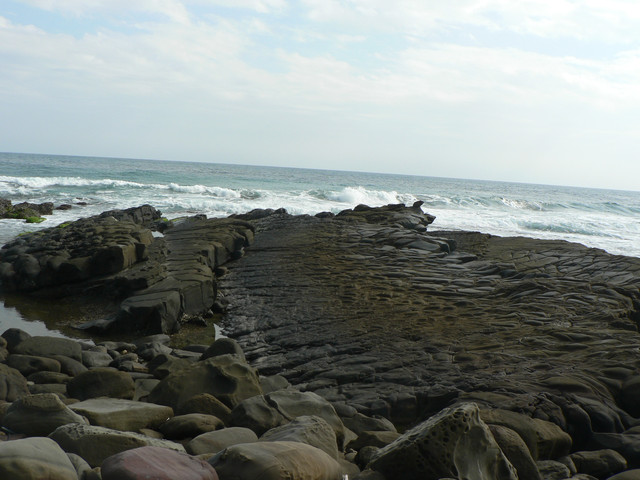 海蝕平台和巨卯石礫海岸造形十分擉特.延著海岸線往佳樂水前進.看見2萬8千噸貨輪幸福號的殘骸枝離破碎散落在海灘上到下午4點