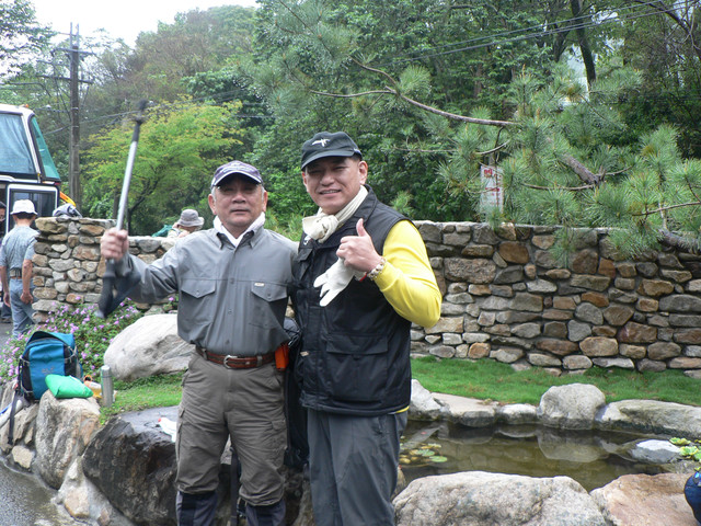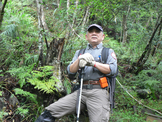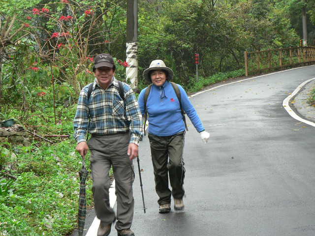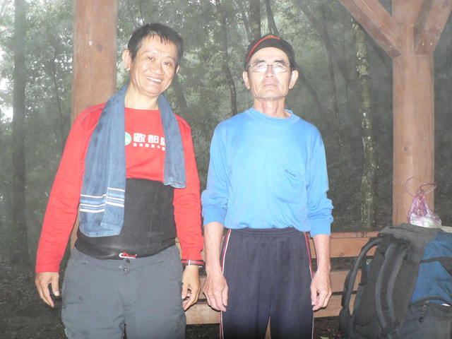 涼亭不久健腳者楊先生以由大雪山林道回到涼亭.楊先生和阿彬都是61歲.而楊先生健步如飛.故開玩笑的問楊先生吃什麼