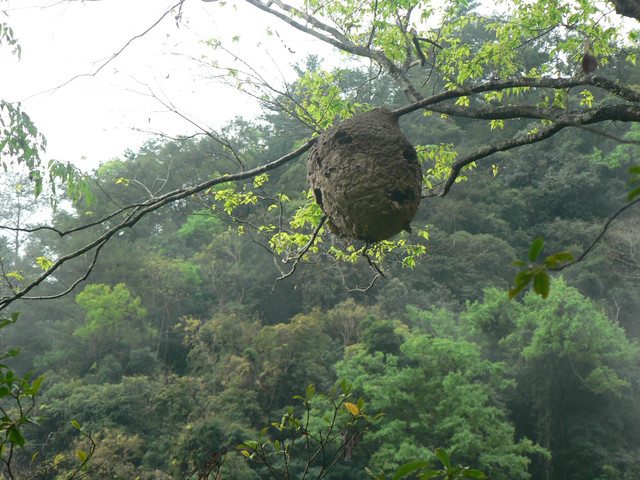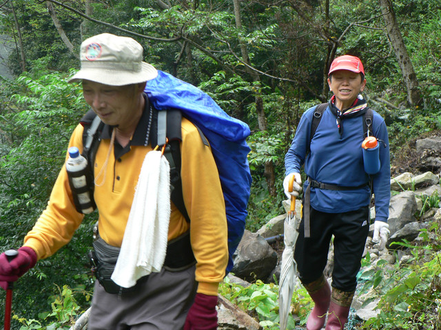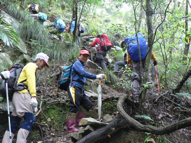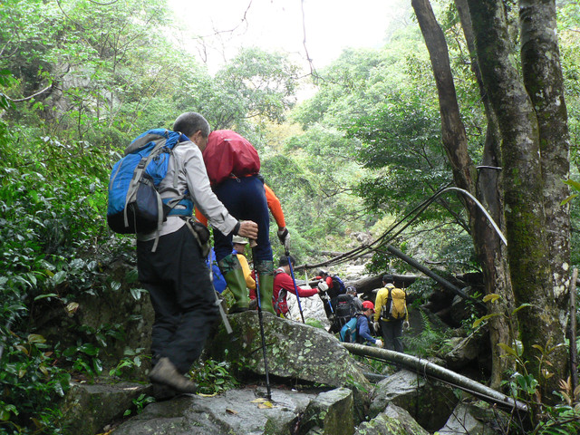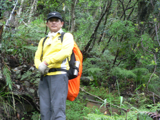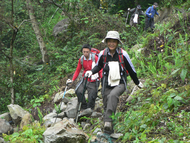 跨過河床又是一波波的陡坡.路上有蕨類一大片以及一些植物相伴.忽然途中下起雨來我認為雨不會太大不用穿雨衣.結果