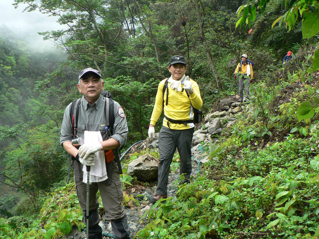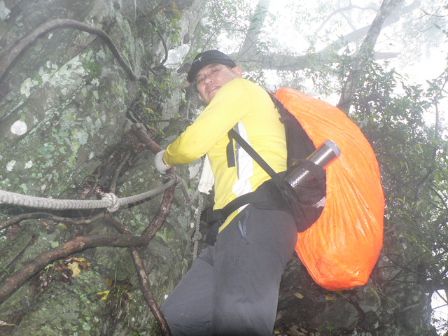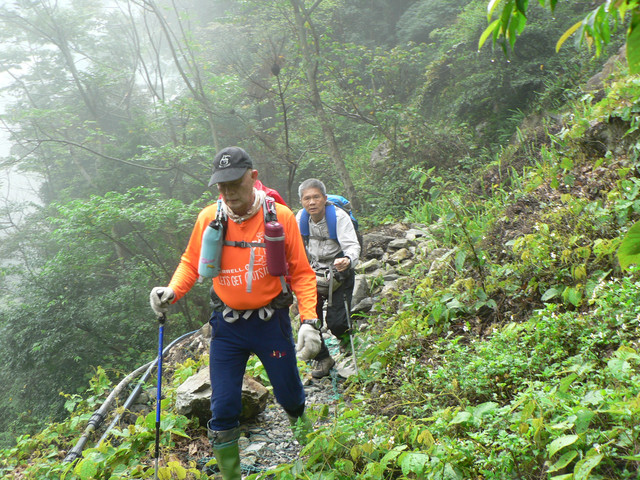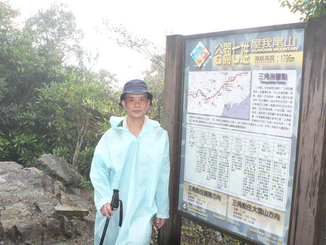 道則時間來不及只剩下先行者繼續奮鬥.當雨較小時走了3~40分才到三角點此時又下起雨來因山頂霧茫茫.所以就立即下山回到