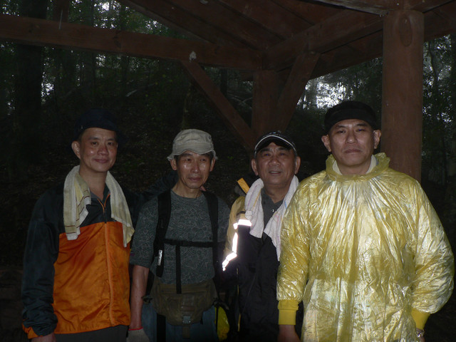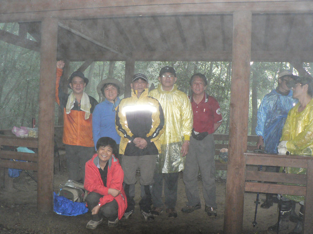 雨愈下愈大背包被淋濕愈背愈重只好在涼亭避雨休息.在涼亭中陸續有人到達大家決定等雨停在攻三角點而大雪山林
