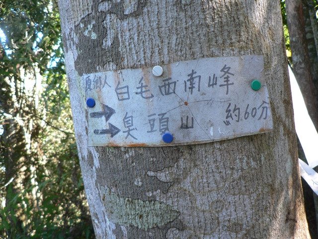 102年1月20日這個星期日好不容易有個不下雨的好天氣大家今日大可動動筯骨車子到了西螺休息站.石仔臨時要我與呂老師蔡老大等去探白毛西南峰.我們欣然的接受.車子到了大甲發電廠我們由大霸通過.循上次白毛山0型縱走的反方面的登山口由果園.儲水鐵桶.柳杉林到白毛山與白毛西南峰交接點取右後下切200公尺到鞍部再上50公尺即是白毛西南峰[臭頭山]山上無三角點.其中下切200公尺因落葉急陡較難行.程度和波津加山差不多只是較遠(發電廠-登山口1小時. 登山口-白毛山與西南峰叉路約1小時-到西南峰約1小時.來回不含休息要6小時.如白毛縱走西南峰要7小時)