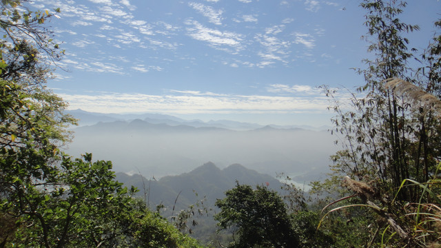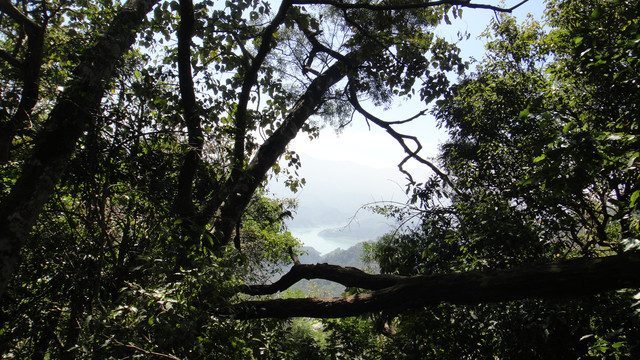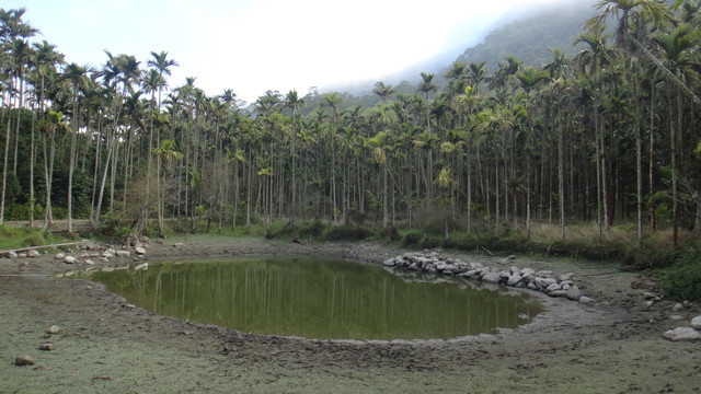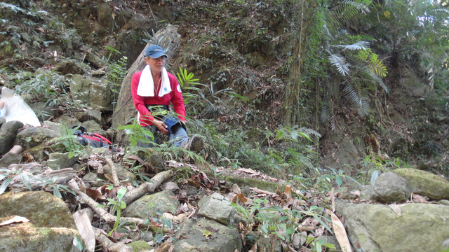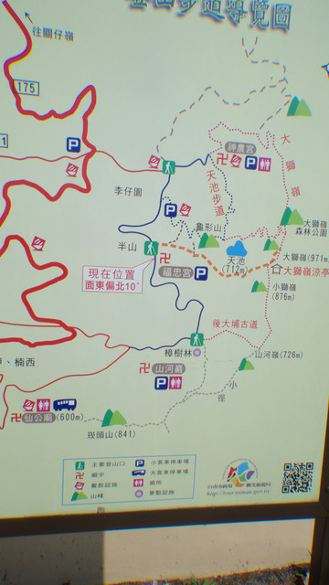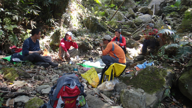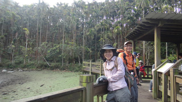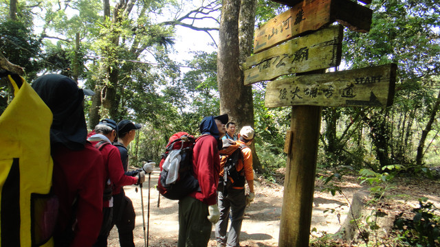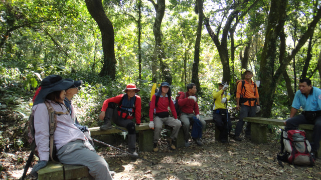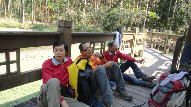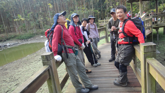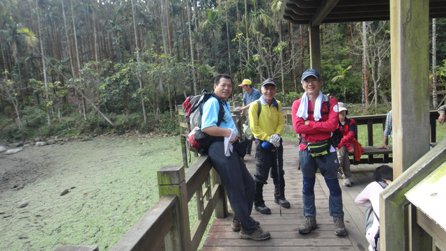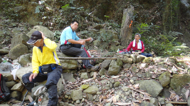 :因阿里山園區採總量管制故取消.我們由蔡老大提議到台南東山鄉李仔園.大小獅嶺.山河巖o型走.0530集合到了[李仔園]約0730.車子停在神農宮.開始由產業道路走到天池.天池有木道以及凉亭.但因早春無雨.天池水快乾枯.我們取捷徑直上大獅嶺.無奈走快到山頂竟查無路.只好乖乖循步道而上大獅嶺.參觀了獅嶺公園往小獅嶺前進.途中路跡尚明.但小獅嶺後下坡路段則不明.顯示少有人走.在此可遠眺曾文水庫.到了694峰和山河巖叉路.大家先上694峰再回叉路往山河巖前進.不久到了一河谷.輕風微涼.時間正午.大家在此休息1小時.後下產業道路到萬福亭.當蔡老大得知好友萬福伯仙逝.不勝唏噓.而現今其孫子.在此備茶讓登山客享用.可繼衣缽.走了不久就到樟樹林.這些樟樹造林約有70年.長得十分高大.因潮溼.樹上長滿蕨類.繼續前進往福忠宮的產業道路很熱.但視野良好.可達眺九龍.大凍.小獅.大獅.等山一脈相承.不久走到天池.在凉亭泡茶.0230回到神農宮停車場