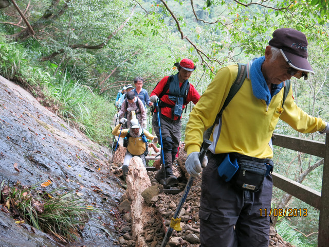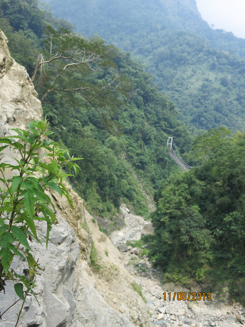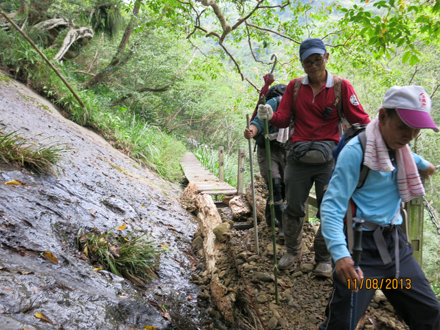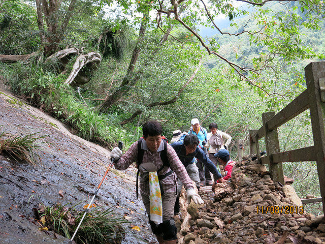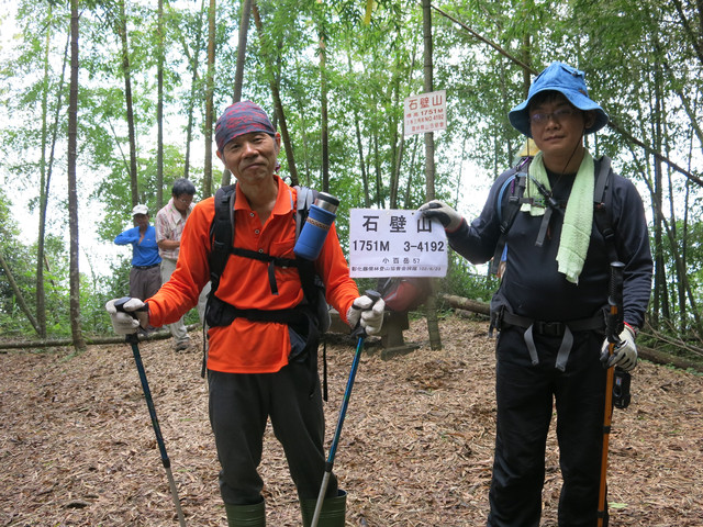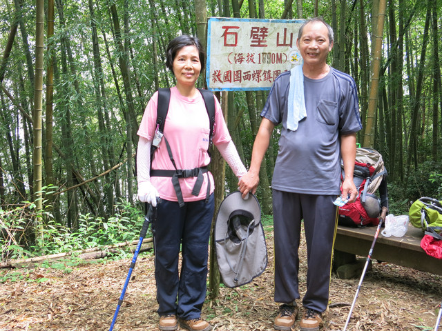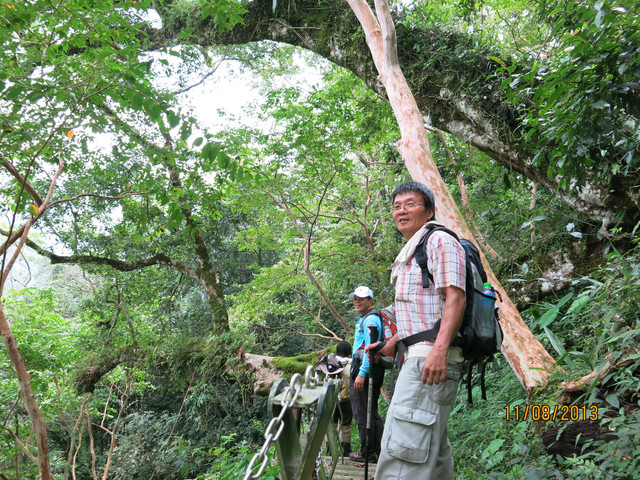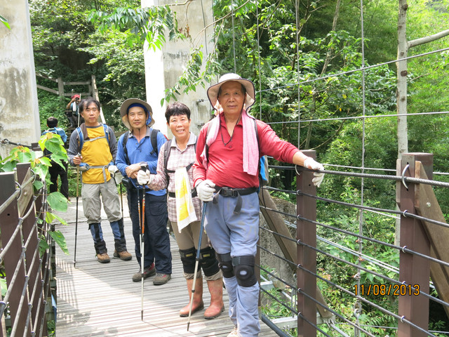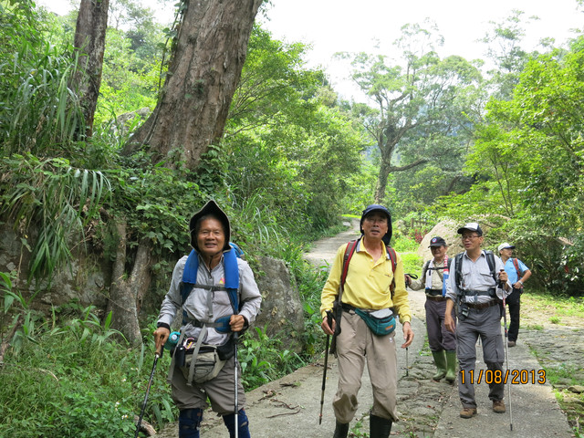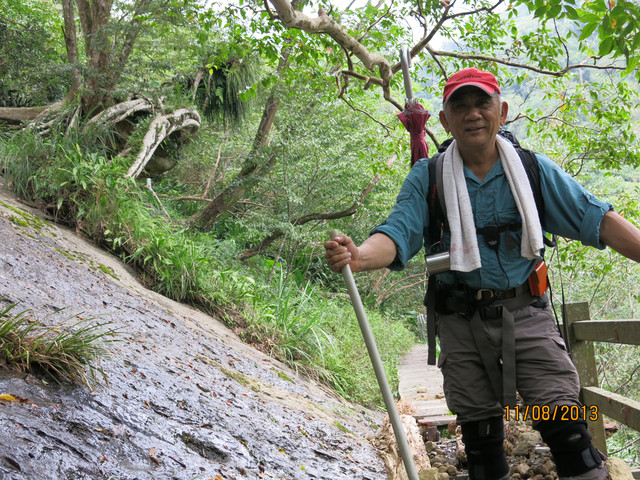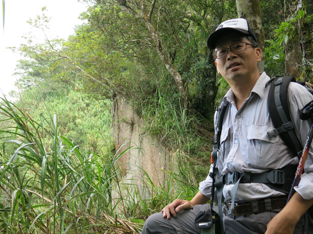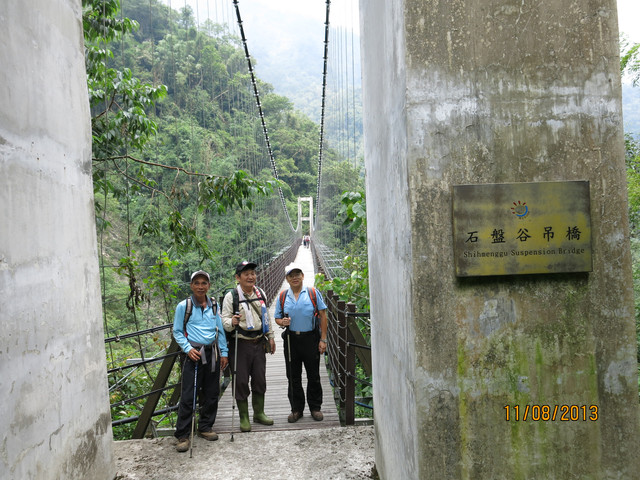 102年8月11日 上次南青走嘉南雲峰時 兩參幹部過石壁山往好望角直下豊山石盤谷探勘.才有此次石壁山越嶺石盤谷之行.8:50分.遊覽車到達九芎神木停車場.整裝後開始由階梯往上爬升400公尺到達平台後右上往石壁山前進半小時大約10:10到達石璧山三角點{1751M}後繼續前進.不久叉路右取[好望角]後一路下坡.但此路通往豊山石盤谷.平日甚少人跡.兩月前探山時還好.今日荒煙漫草.剌籐擋道.石先生拿出鐮刀披荊斬棘.為我們開出小徑.12:00入大石壁棧道.12:30分凉亭休息.1:30分出發.02:00到達石盤谷吊橋 2:50分回豊山聚落
