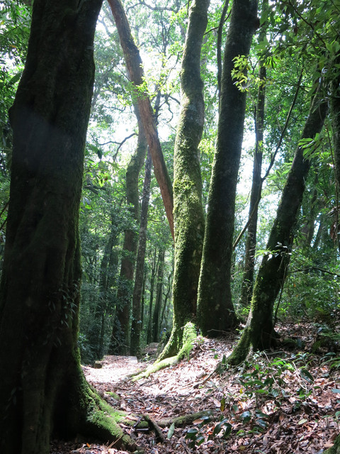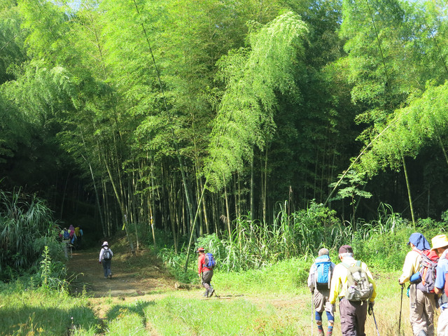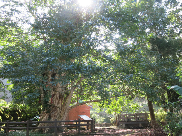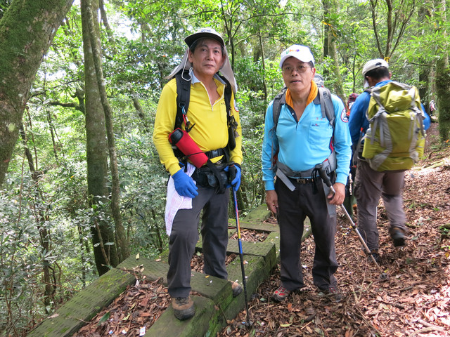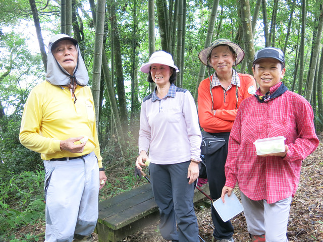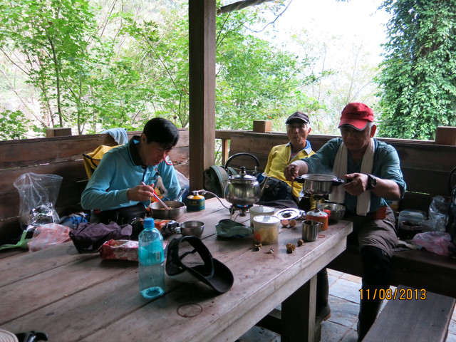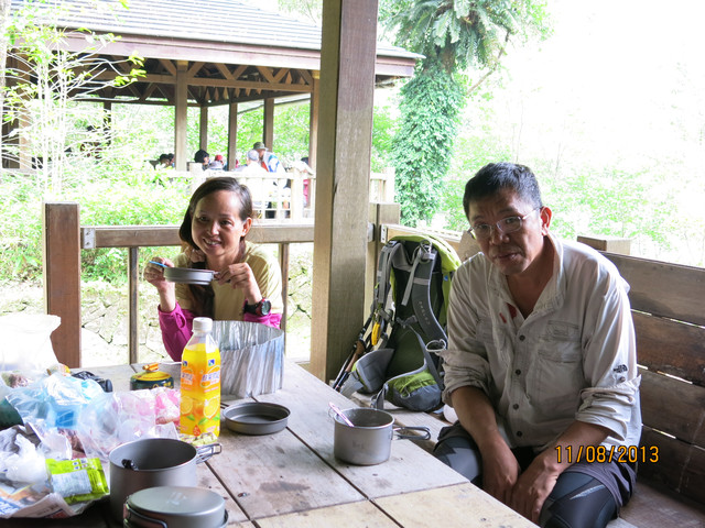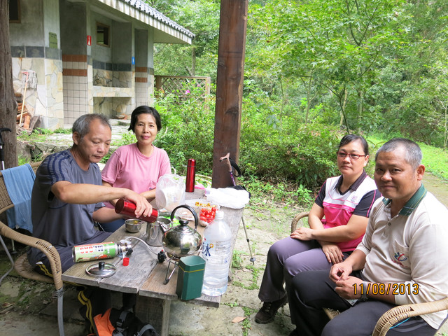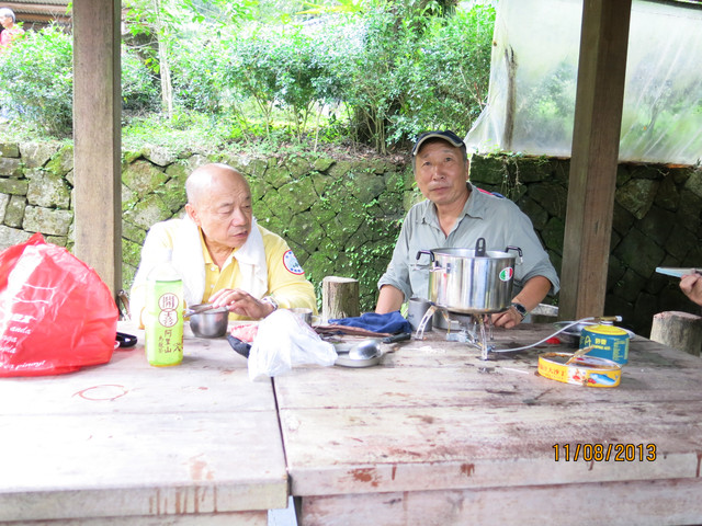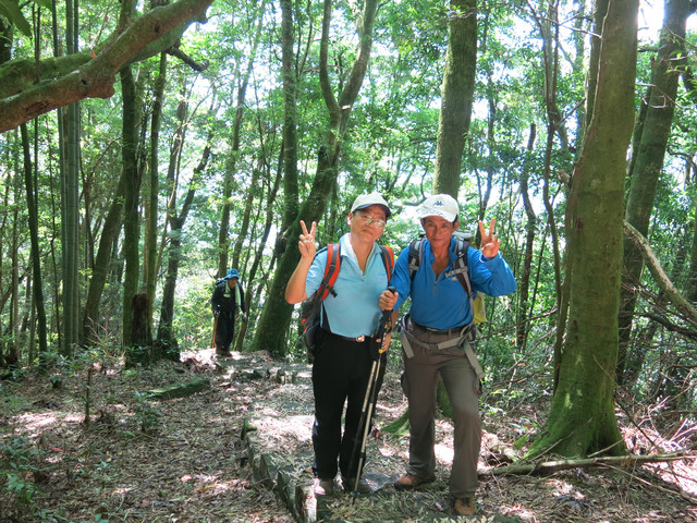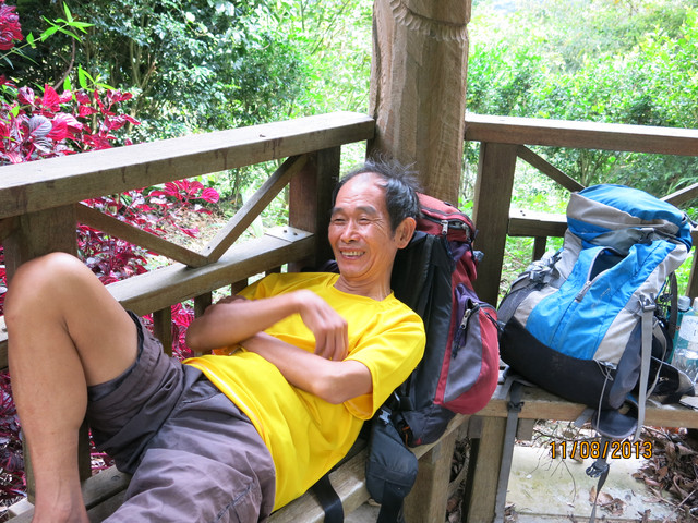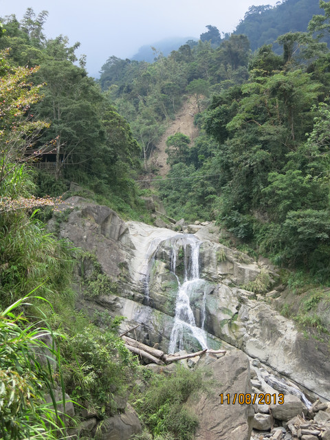 102年8月11日 上次南青走嘉南雲峰時 兩參幹部過石壁山往好望角直下豊山石盤谷探勘.才有此次石壁山越嶺石盤谷之行.8:50分.遊覽車到達九芎神木停車場.整裝後開始由階梯往上爬升400公尺到達平台後右上往石壁山前進半小時大約10:10到達石璧山三角點{1751M}後繼續前進.不久叉路右取[好望角]後一路下坡.但此路通往豊山石盤谷.平日甚少人跡.兩月前探山時還好.今日荒煙漫草.剌籐擋道.石先生拿出鐮刀披荊斬棘.為我們開出小徑.12:00入大石壁棧道.12:30分凉亭休息.1:30分出發.02:00到達石盤谷吊橋 2:50分回豊山聚落