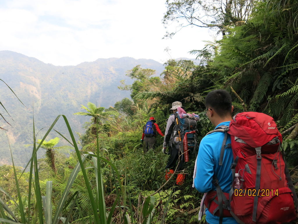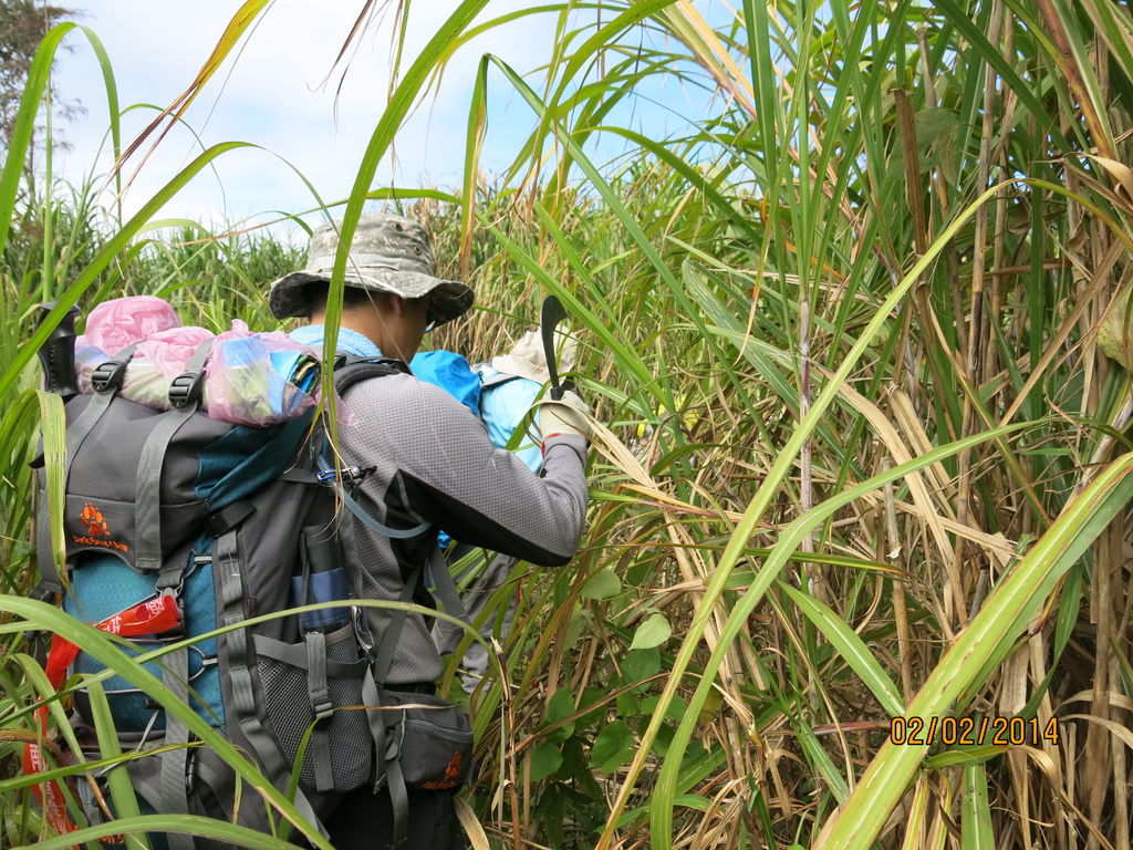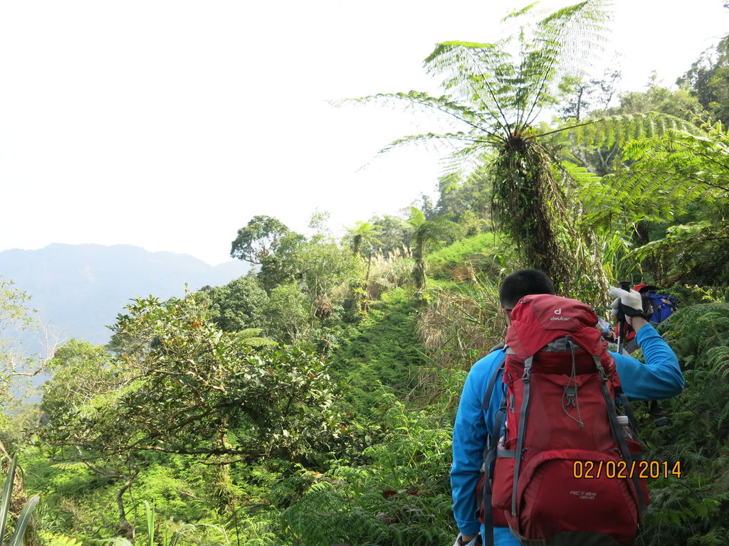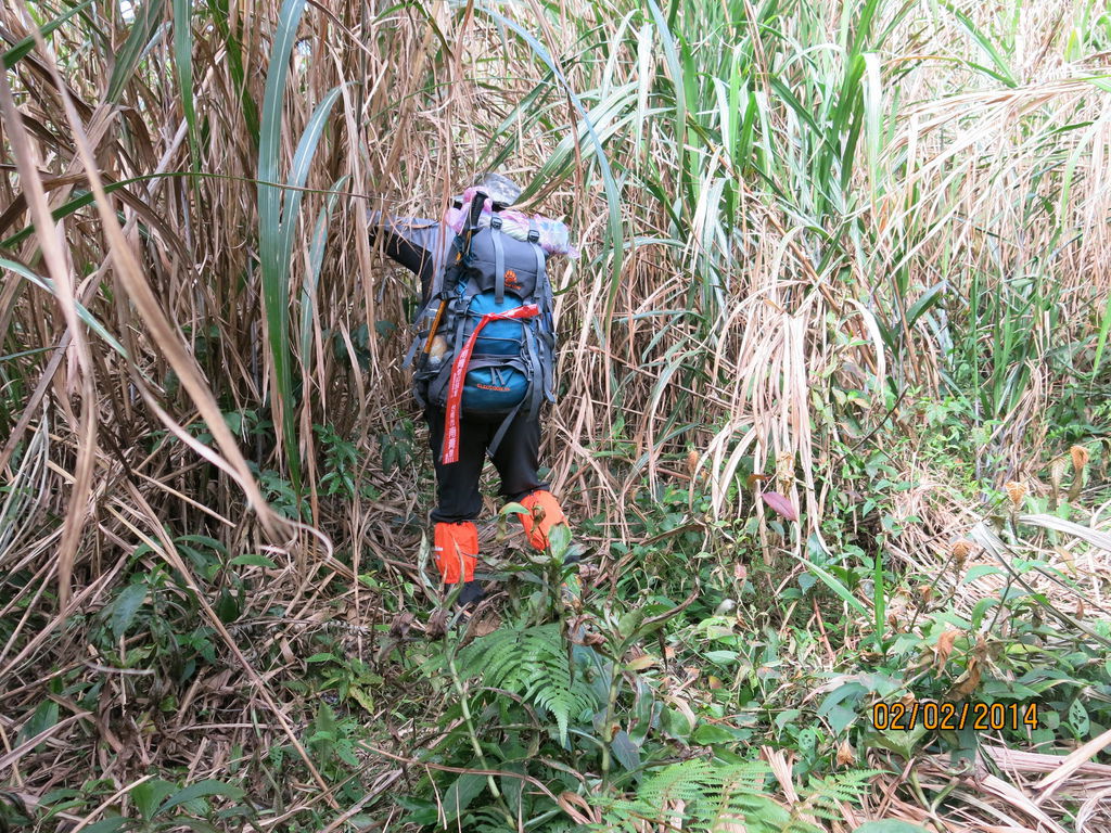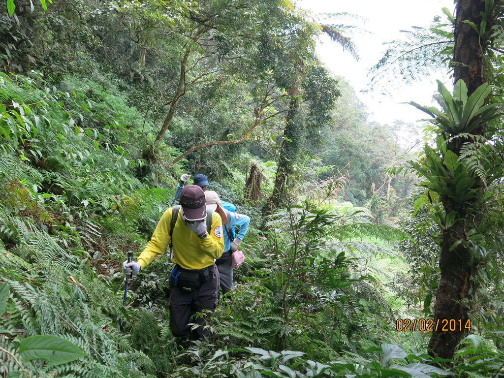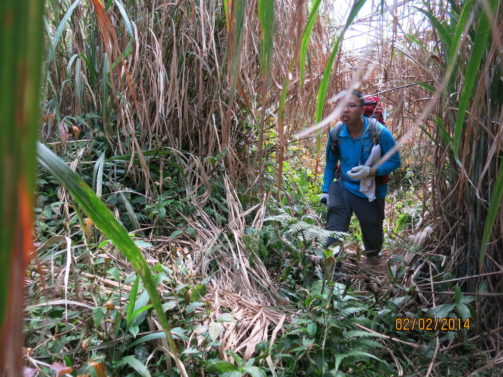 20140202兩台車子在am0730到達屏東萬安林道3k處(H200M)處停車後開始延著林道緩緩而上.這是石明哲與張忠孝前輩一段銘心的記憶.他們由佳義小學起登上真笠山.葉根山在往日湯真山途中右下山徑連接萬安林道到萬安.5年了讓他們緬懷的山徑是否無恙.今日石先生將帶領我們重回他的舊夢.走了3小時多.11點到達林道終點也是廢棄蘭花園平台但找不到連接葉根到日湯真的山徑.只是一大片比人高的芒草.石先生.simon.拿出鏈刀開路好不容易才找到路.鑽出來要帶我們過去.路又不見了.最後被忠孝前輩找到.在芒草陣中.真的.分不出東南西北.花1小時多才接上山徑.但此山徑少有人走己成獸徑而一旁是斷崖走起來+分危險.到了下午1點10分休息午餐.見時間不早如繼續前進回來恐怕摸黑.雖然離日湯真與葉根的三叉路只剩1000公尺也只好回頭了.回到蘭花園已pm0310我們順爬亞麻灣山.但也找不到登山口.問當地人結果得到錯誤信息.用鏈刀開了1小時的路才接上路徑.時間不足差400公尺就登頂而回航.而下登山口卻只用了15分.也就是說上山多走1小時.而回到停車處天已黑了.雖然兩處行程都沒有走完.但連接葉根到日湯真的山徑+分原始像蠻荒世界.蕨類叢生而且視野廣大.我認為爬山過程比登頂重要.而當然登頂就是一項自我挑戰的完成.感謝大家讓我有美好的一天